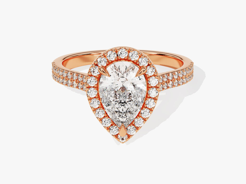 Make a profound statement of love with the Double Shank Pear Halo Lab Grown Diamond Engagement Ring. The star of this design is a stunning pear-cut lab-grown diamond, meticulously created to emphasize its remarkable clarity and captivating beauty. The double shank design adds a contemporary and refined touch, symbolizing the unique journey of your love. The intricate halo setting, featuring ethically sourced diamonds, creates an atmosphere of refinement and elegance.