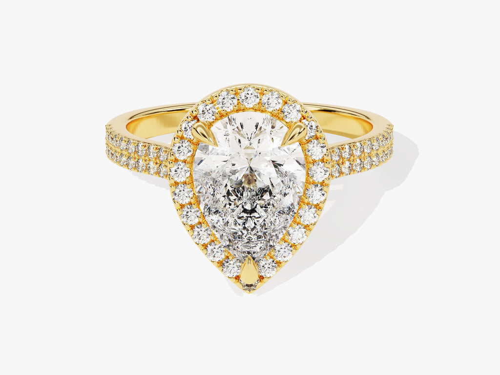Choose our Double Shank Pear Halo Lab Grown Diamond Engagement Ring to celebrate your love story, a seamless blend of timeless elegance and modern refinement. At its core, a dazzling pear-cut lab-grown diamond takes center stage, designed to captivate with its remarkable clarity. The double shank design adds a modern twist to the ring, symbolizing the intertwined journey of your love.