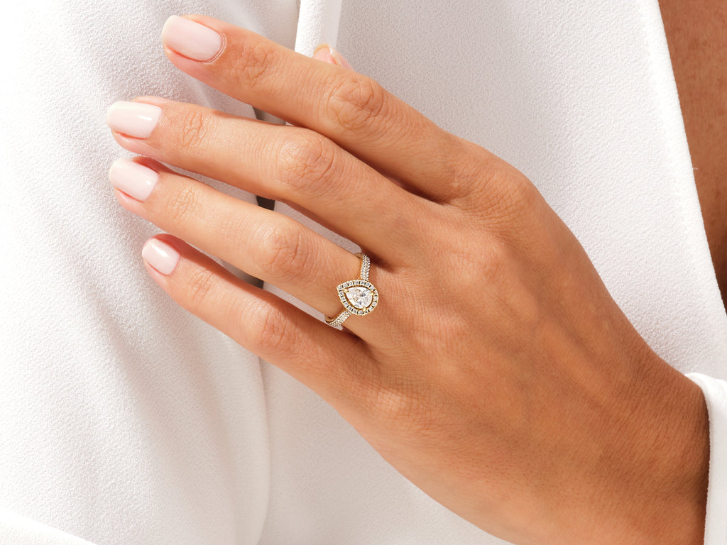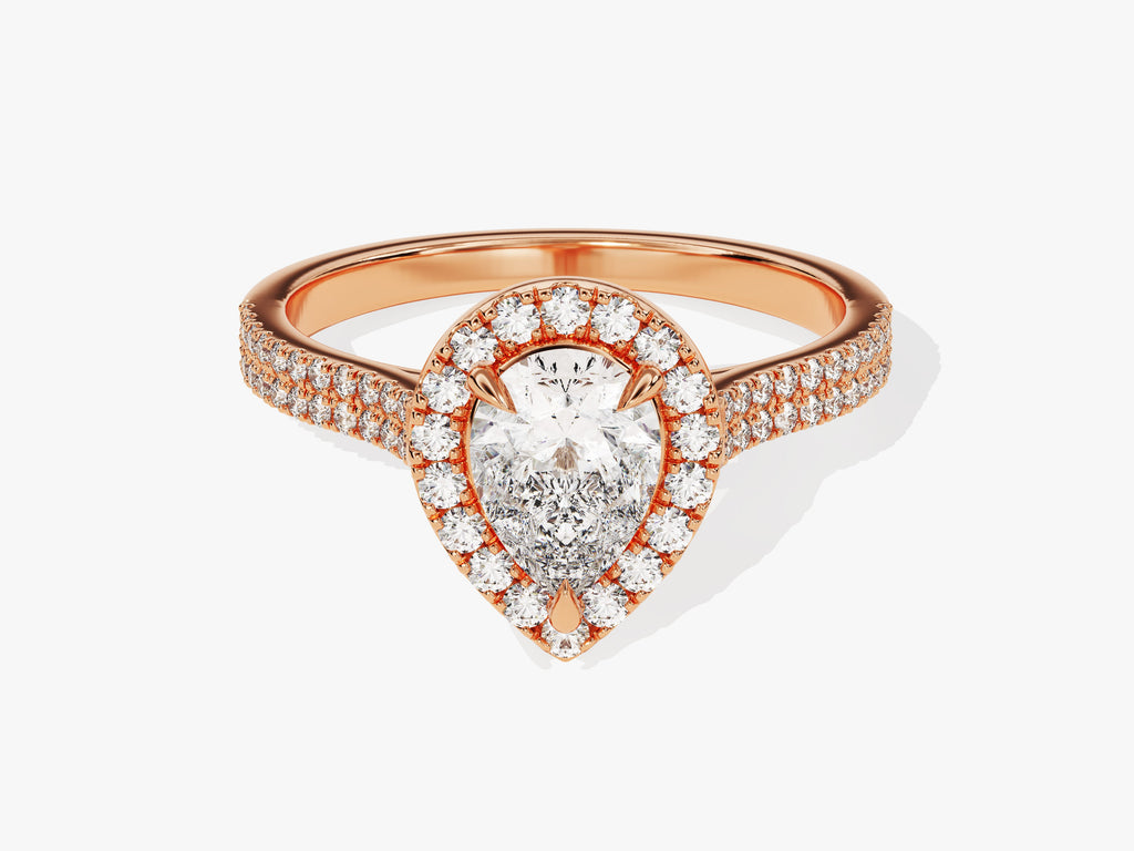 Elevate your proposal with unmatched elegance and charm using our Double Shank Pear Halo Moissanite Engagement Ring. This exceptional ring features a brilliant pear-cut moissanite center stone, celebrated for its captivating brilliance. It is beautifully framed by a halo of smaller moissanite stones, creating a dazzling display of shimmer and opulence. The double shank band adds a touch of unique sophistication, making this ring a symbol of your enduring love.