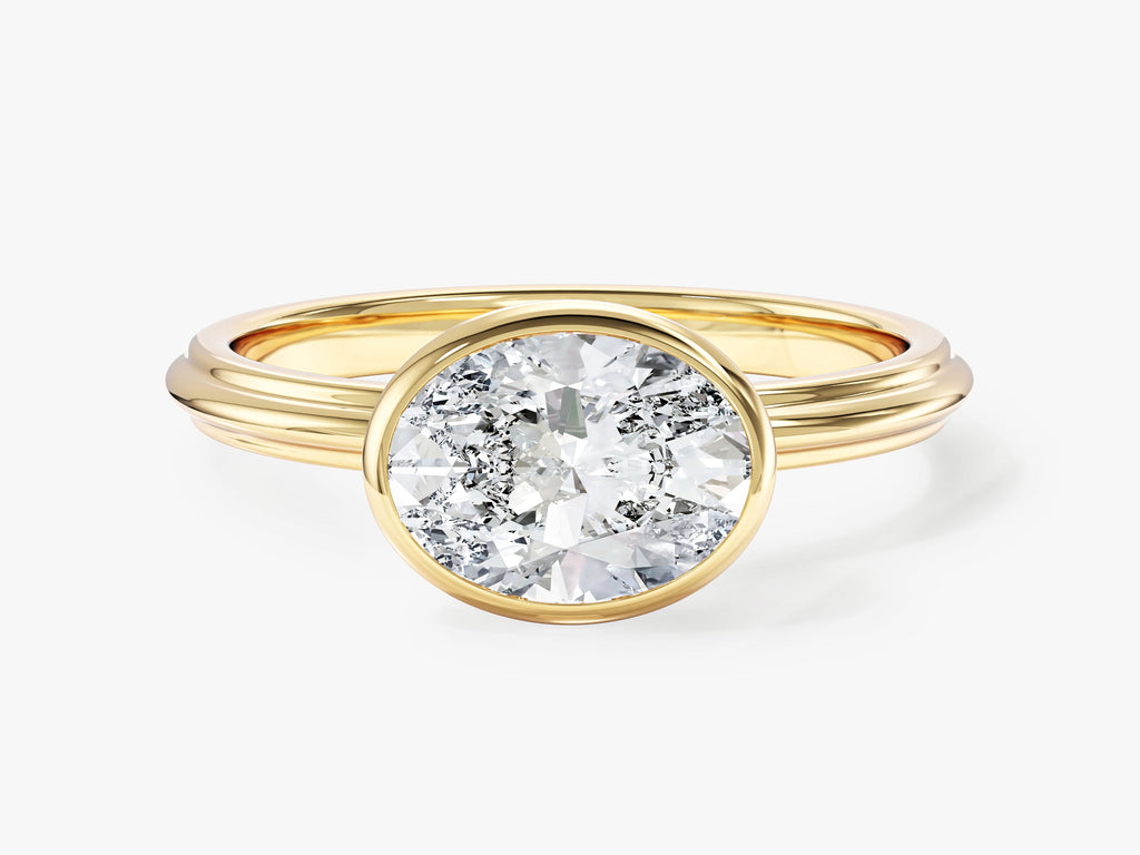 Effortlessly modern and elegantly refined, this design features an oval center set in a striking east-west orientation. The horizontal setting adds a contemporary edge to a timeless shape, creating a look that’s both minimalist and distinctive. Perfect for those who seek modern sophistication with subtle individuality.