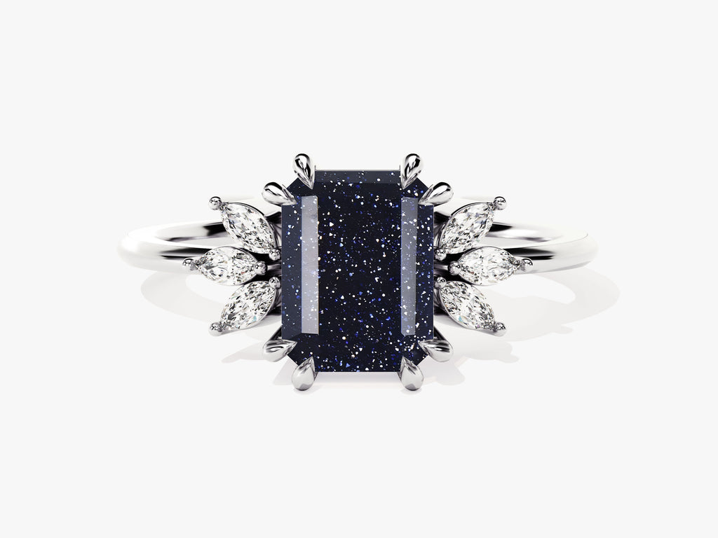 Emerald Cut Blue Sandstone Engagement Ring with Marquise Moissanite Sidestones