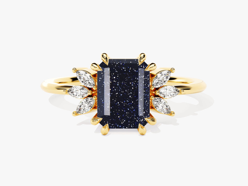 Immerse yourself in the enchanting beauty of our Emerald Cut Blue Sandstone Engagement Ring with Marquise Moissanite Sidestones. The focal point is a captivating emerald-cut blue sandstone, reminiscent of a starry night sky. Embraced by the graceful lines of marquise moissanite sidestones, this ring blends modern sophistication with timeless allure.