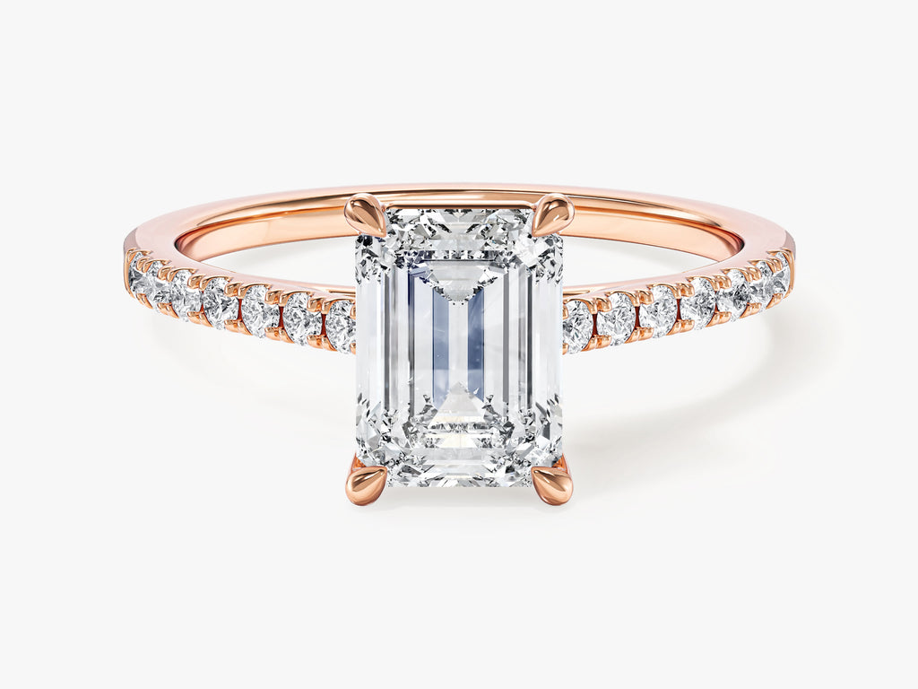 As a symbol of your love, our Emerald Cut Lab Grown Diamond Engagement Ring with Pave Set Side Stones reflects timeless beauty ensuring it will be cherished for generations to come. At its core, a stunning emerald-cut lab-grown diamond takes center stage, designed to captivate with its remarkable clarity and unique allure. The pave setting, adorned with ethically sourced side stones, adds an extra layer of shimmer.