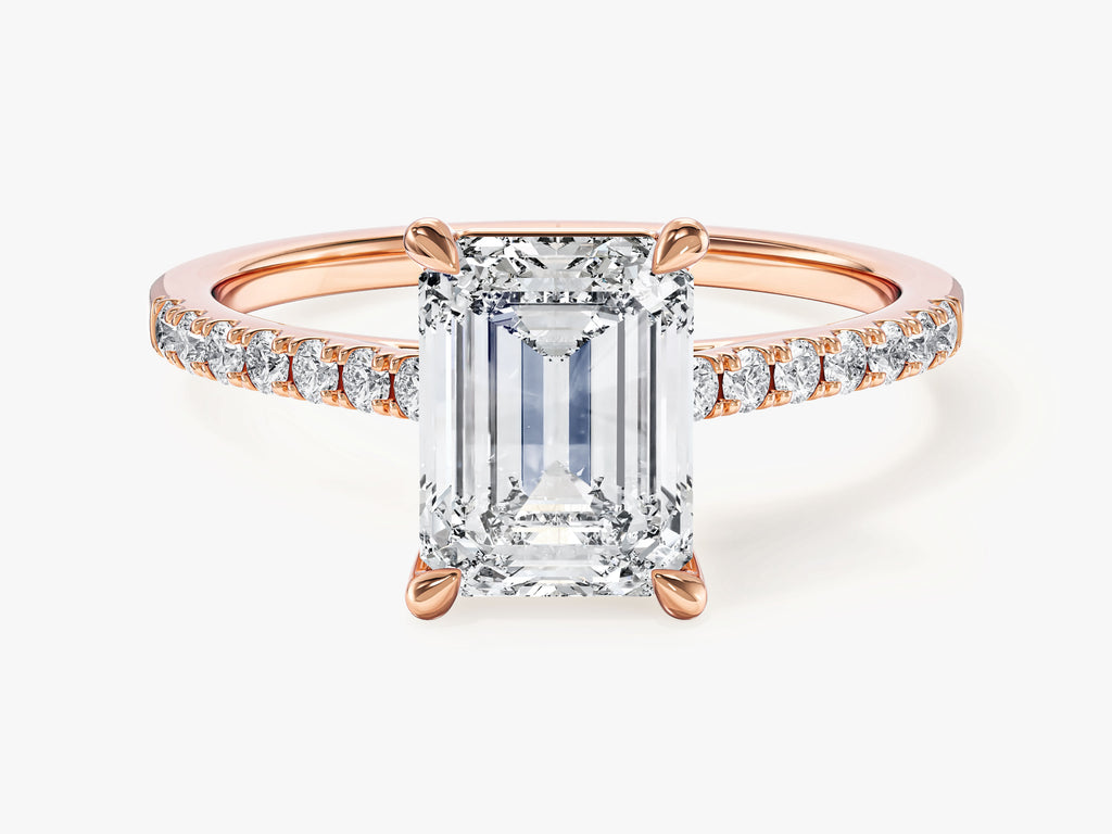 Make a profound statement of love with the Emerald Cut Lab Grown Diamond Engagement Ring and its Pave Set Side Stones. The centerpiece of this design is a dazzling emerald-cut lab-grown diamond, meticulously created to emphasize its remarkable clarity and captivating beauty. The intricate pave setting, featuring ethically sourced diamonds, creates an atmosphere of refinement and elegance, echoing your commitment to ethical sourcing and sustainability.