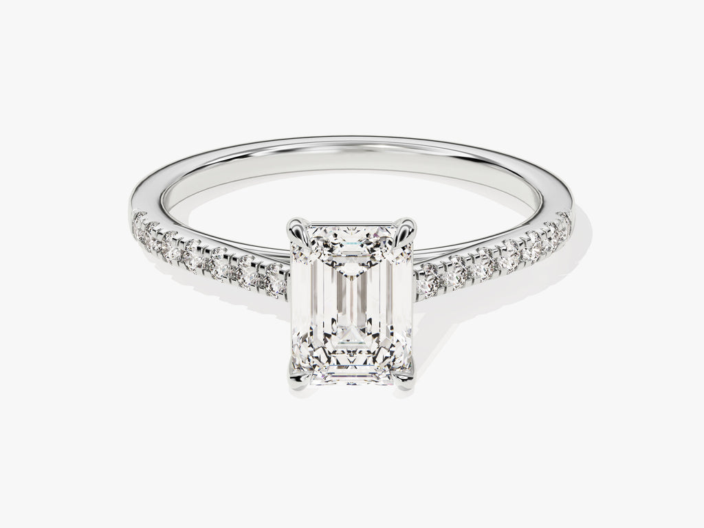 Experience regal beauty with our Emerald Cut Moissanite Engagement Ring featuring Pave Set Side Stones. This captivating ring showcases a magnificent emerald-cut moissanite center stone, celebrated for its timeless elegance and brilliance. The band is gracefully adorned by smaller moissanite stones, meticulously set in a pave style, creating a spectacular display of shimmer and opulence.