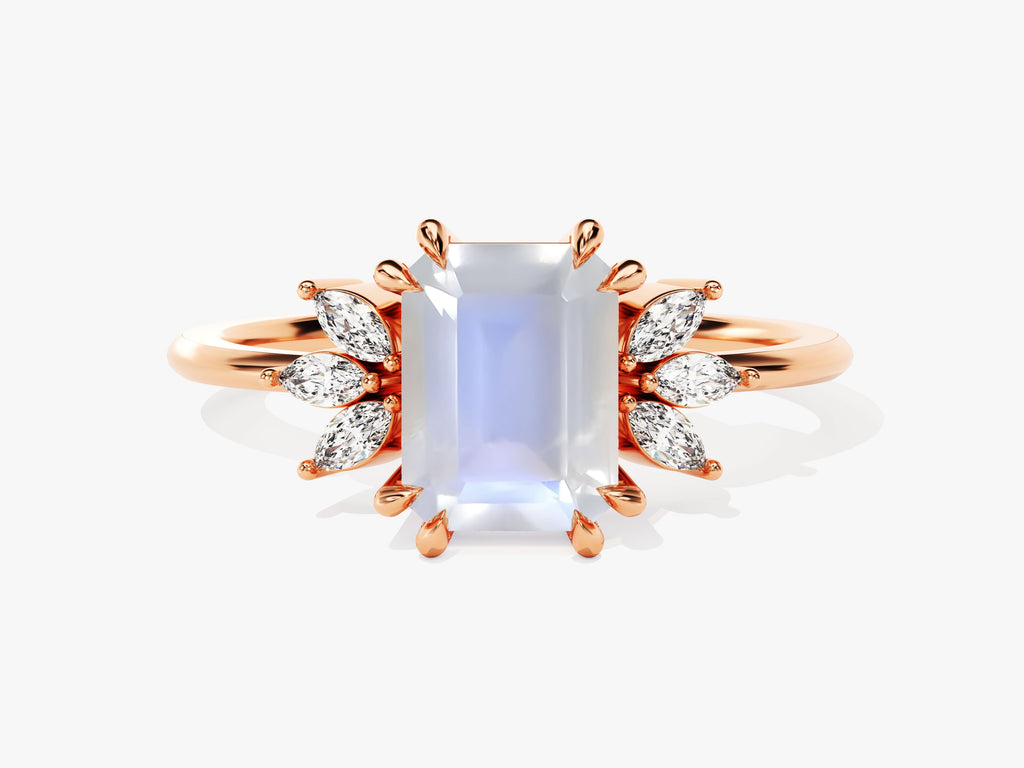 Emerald Cut Moonstone Engagement Ring with Marquise Moissanite Sidestones
