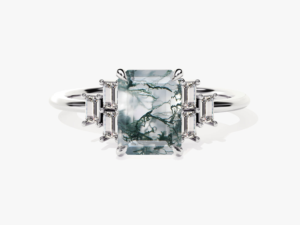 Emerald Cut Moss Agate Engagement Ring with Baguette Moissanite Sidestones