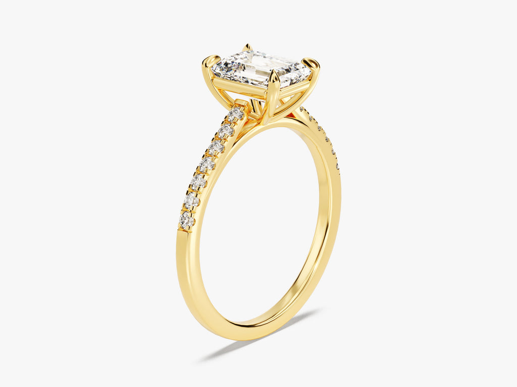 As a symbol of your love, our Emerald Cut Diamond Engagement Ring with Pave Set Side Stones reflects timeless beauty ensuring it will be cherished for generations to come. At its core, a stunning emerald-cut diamond takes center stage, designed to captivate with its remarkable clarity and unique allure. The pave setting, adorned with side stones, adds an extra layer of shimmer.