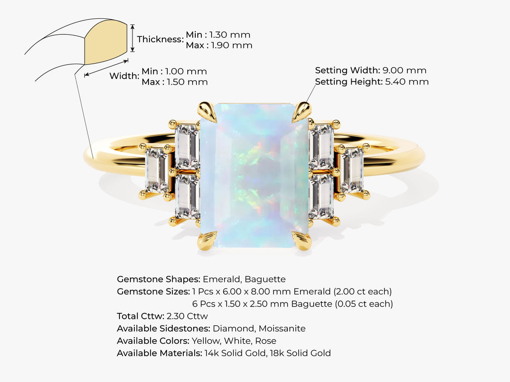 Embark on a journey of iridescence with our Emerald Cut Opal Engagement Ring featuring Baguette Moissanite Sidestones. The focal point of this enchanting ring is the mesmerizing emerald-cut opal, radiating a kaleidoscope of colors with every movement. The play of light within the opal, coupled with the brilliant sparkle of moissanite, creates a dynamic and captivating visual symphony.