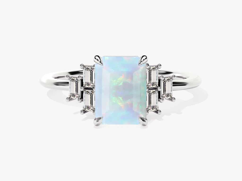 Emerald Cut Opal Engagement Ring with Baguette Moissanite Sidestones