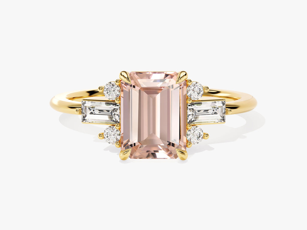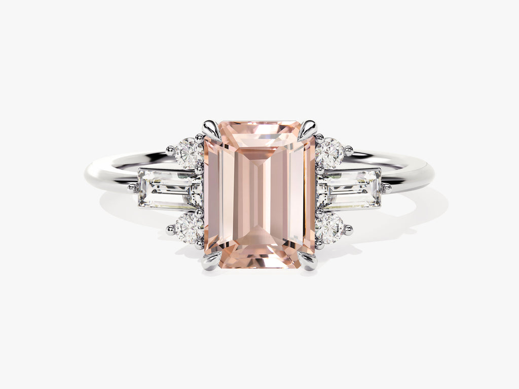 Emerald Cut Peach Morganite Engagement Ring with Baguette and Round Sidestones