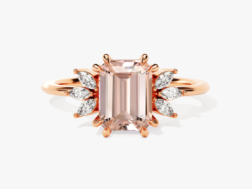 Emerald Cut Peach Morganite Engagement Ring with Marquise Sidestones
