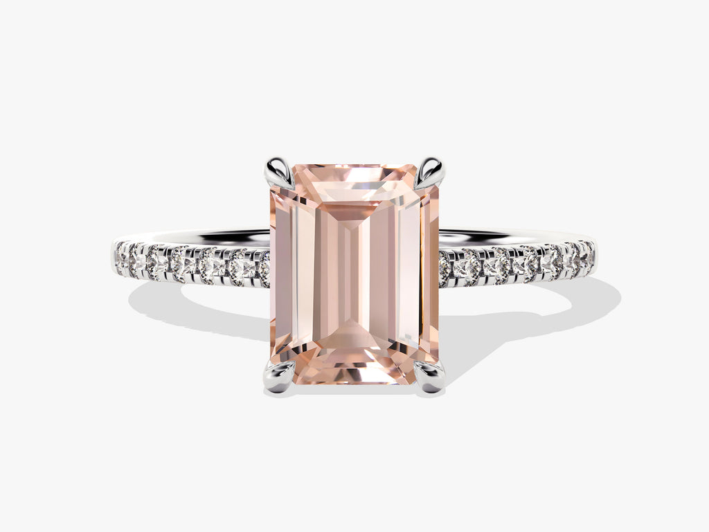 This enchanting engagement ring embodies timeless elegance with a touch of modern flair. The heart of this ring is a captivating emerald-cut peach morganite gemstone. This mesmerizing stone boasts a soft, romantic hue and a unique rectangular cut. The versatile engagement ring allows you to personalize it with your choice of side stones, making it a treasured piece that reflects your unique taste and will be cherished for a lifetime.