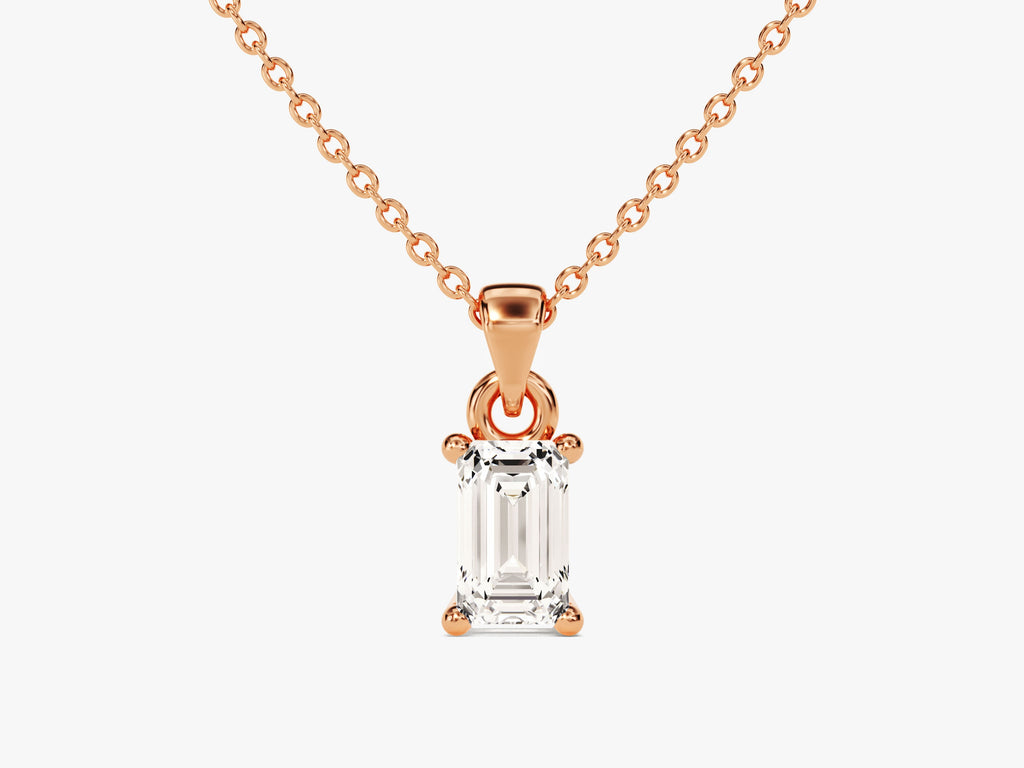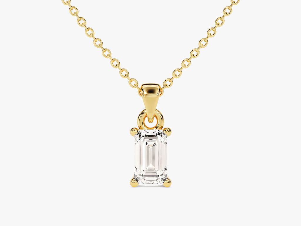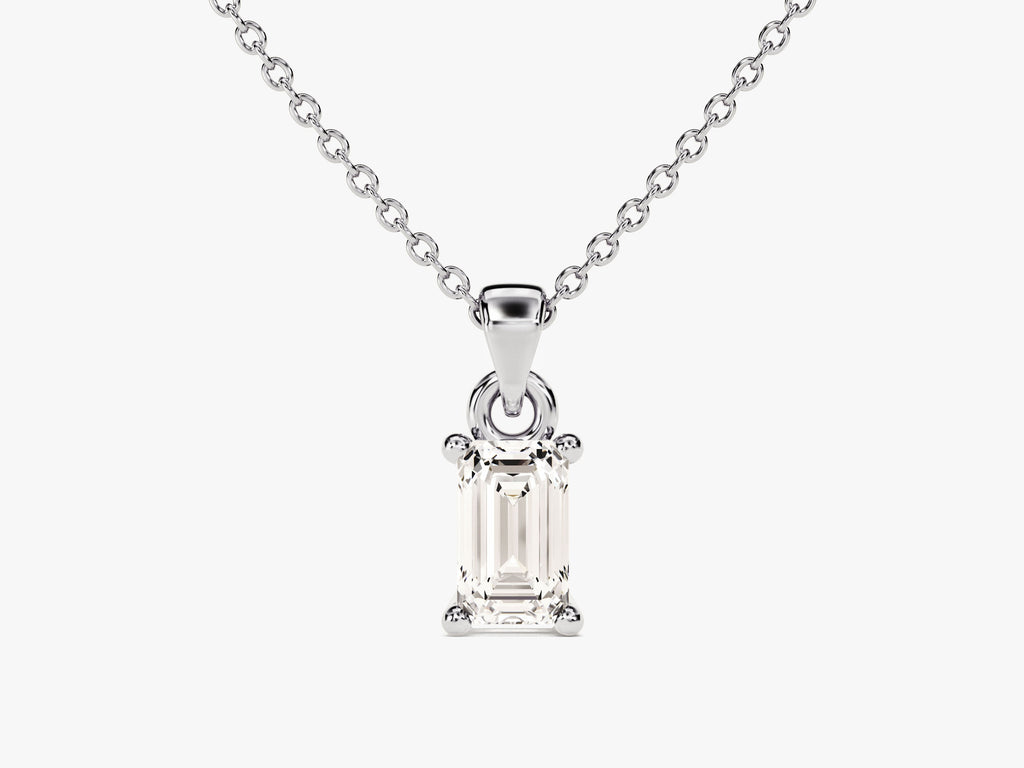 You will be the center of attention with this elegant solitaire pendant. This simple yet classic design is made to last for a lifetime and is sure to showcase the unique beauty of your 0.50 ct emerald cut lab grown diamond or moissanite in the most dazzling way possible.