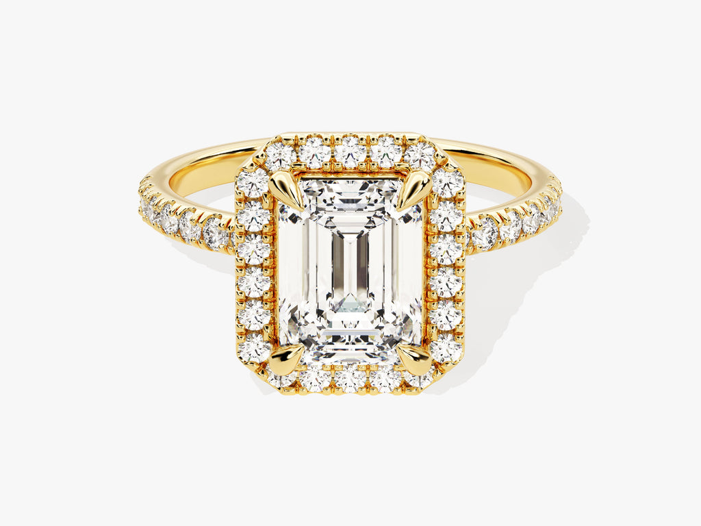 Experience the redefined radiance of luxury with our Emerald Halo Moissanite Engagement Ring featuring Pave Set Side Stones. At its core is a dazzling emerald-cut moissanite, known for its radiant brilliance and grace. The moissanite is elegantly embraced by a halo of smaller stones, meticulously set in a pave style, creating an enchanting play of light and sparkle.