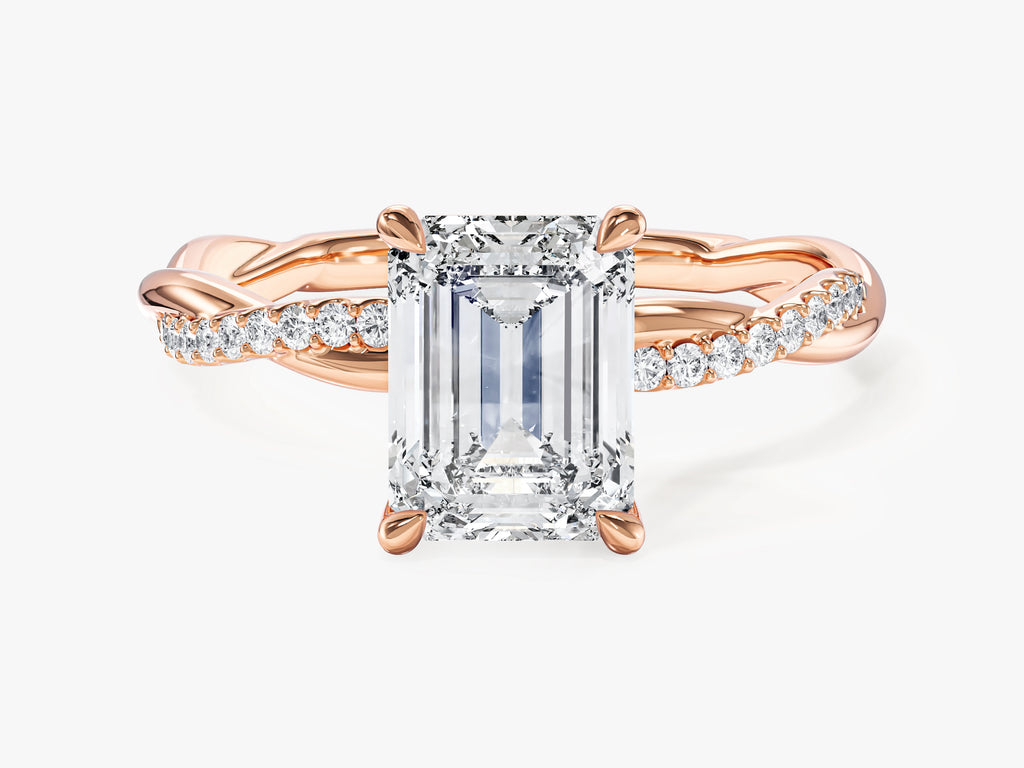 Discover the brilliance of our Emerald Twisted Lab Grown Diamond Engagement Ring and its Pave Set Side Stones, gracefully merging classic charm with modern opulence. The centerpiece of this design is a dazzling emerald-cut lab-grown diamond, meticulously created to emphasize its remarkable clarity and captivating beauty. The band's unique twisted design adds a touch of refinement, symbolizing the intricate journey of your love.