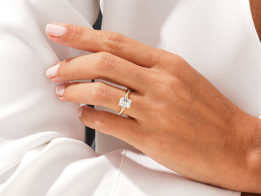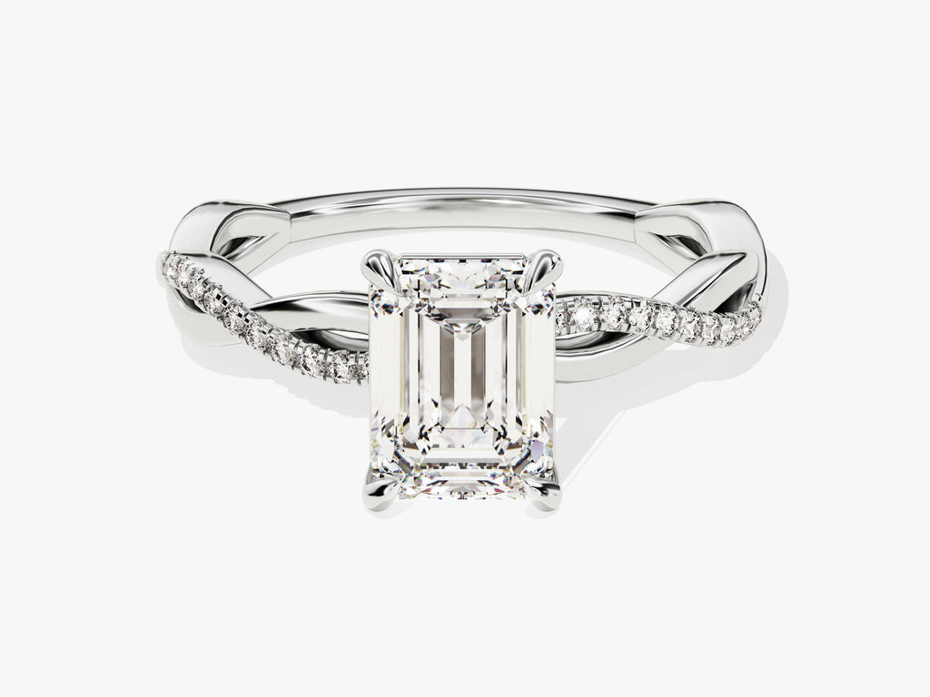 Experience the unveiling of radiant beauty with our Emerald Twisted Moissanite Engagement Ring featuring Pave Set Side Stones. At its heart is a breathtaking emerald-cut moissanite known for its exquisite brilliance and grace. The moissanite is nestled within a gracefully twisted band, adorned with smaller stones meticulously set in a pave style, creating an enchanting play of light and sparkle.