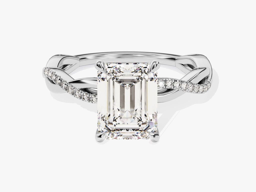 The Emerald Twisted Moissanite Engagement Ring is a modern and elegant symbol of love and devotion. This exquisite ring features a stunning emerald-cut moissanite at its center. Its intricate twisted band design adds a unique and romantic touch to the classic solitaire style. Along the band, small moissanite stones are meticulously set using the paving technique, adding a touch of sophistication to the overall design.