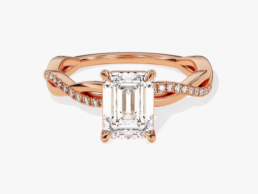 Prepare to be enchanted by the brilliance of our Emerald Twisted Diamond Engagement Ring with Pave Set Side Stones. This exceptional ring features a stunning emerald-cut diamond, meticulously crafted to enhance its exceptional clarity and captivating charm. The band's unique twisted design adds a touch of modern sophistication to the ring, symbolizing the intricate journey of your love.