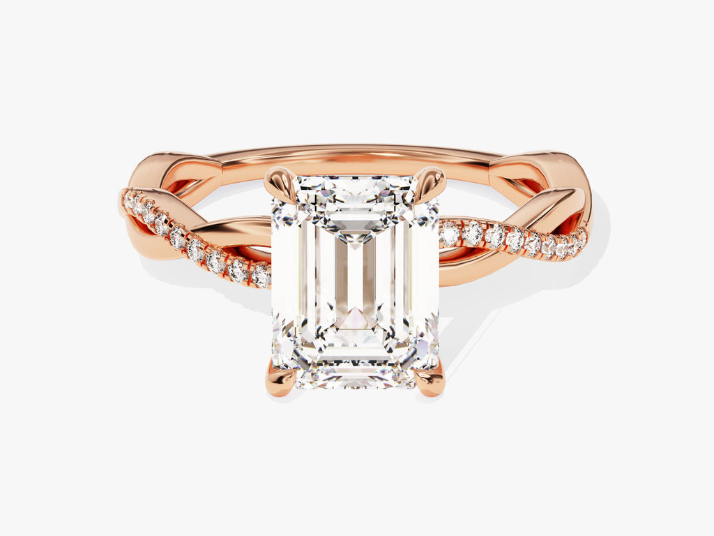 Discover the brilliance of our Emerald Twisted Diamond Engagement Ring and its Pave Set Side Stones, gracefully merging classic charm with modern opulence. The centerpiece of this design is a dazzling emerald-cut diamond, meticulously created to emphasize its remarkable clarity and captivating beauty. The band's unique twisted design adds a touch of refinement, symbolizing the intricate journey of your love.