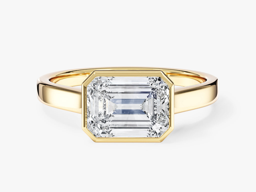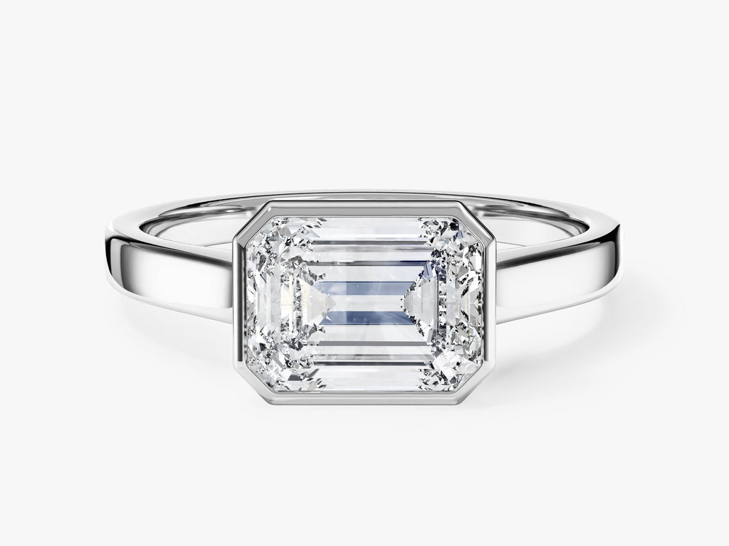 A sleek flat band showcases a stunning emerald-cut center stone, highlighting its clean lines and classic brilliance. Timeless elegance meets modern refinement in one striking piece.