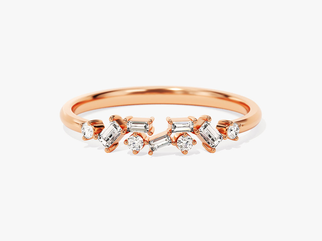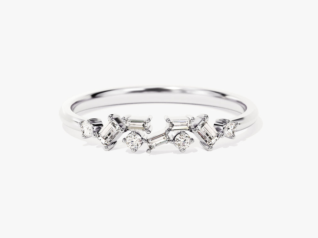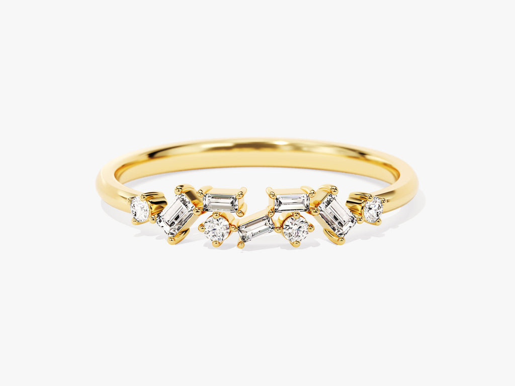 Experience timeless beauty with our Floating Baguette Cluster Ring. Meticulously crafted from gold vermeil, sterling silver and solid gold, this ring features a stunning half eternity design adorned with exquisite diamonds - moissanite, creating a captivating and refined piece. Whether chosen for its symbolic meaning or as a dazzling accessory, its elegance adds a touch of sophistication and brilliance to your ensemble, symbolizing enduring love and style.