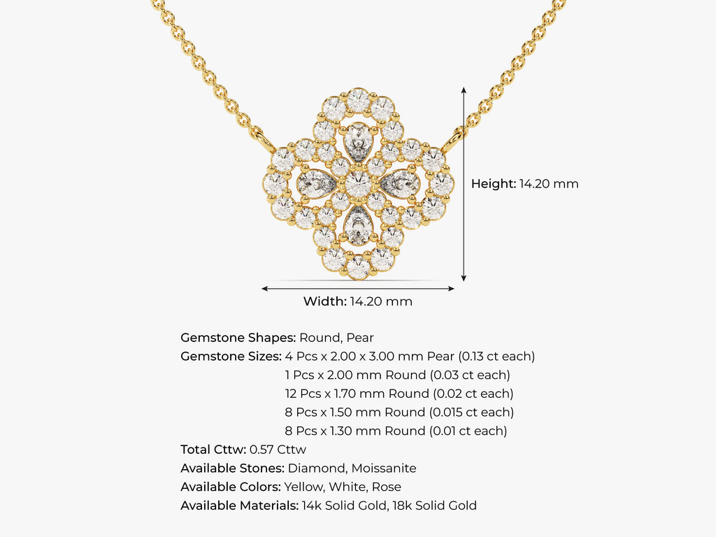 • Number of Stones and Size: 4 x 2.00 mm x 3.00 mm Pear (0.13 ct each), 1 x 2.00 mm Round (0.03 ct), 12 x 1.70 mm Round (0.02 ct each), 8 x 1.50 mm Round (0.015 ct each), 8 x 1.30 mm Round (0.01 ct each)