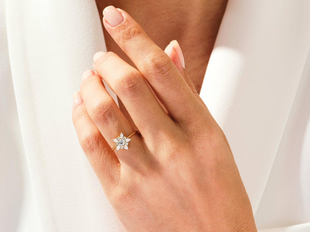 This Floral Halo Moissanite Engagement Ring is a timeless and sophisticated choice for a memorable proposal. The intricate floral halo and shimmering moissanite stone offer an elegant and unique look that will symbolize your love for years. Capture the moment with this enduring symbol of beauty and commit to it forever.