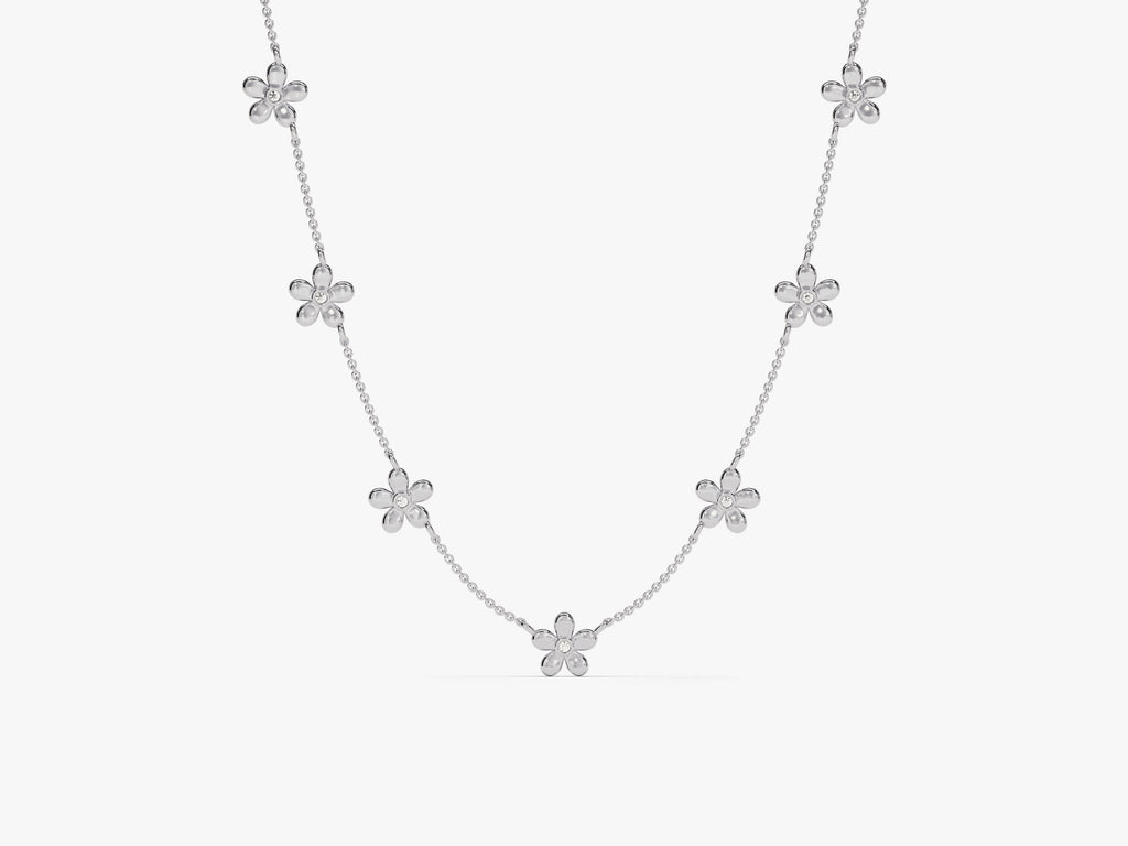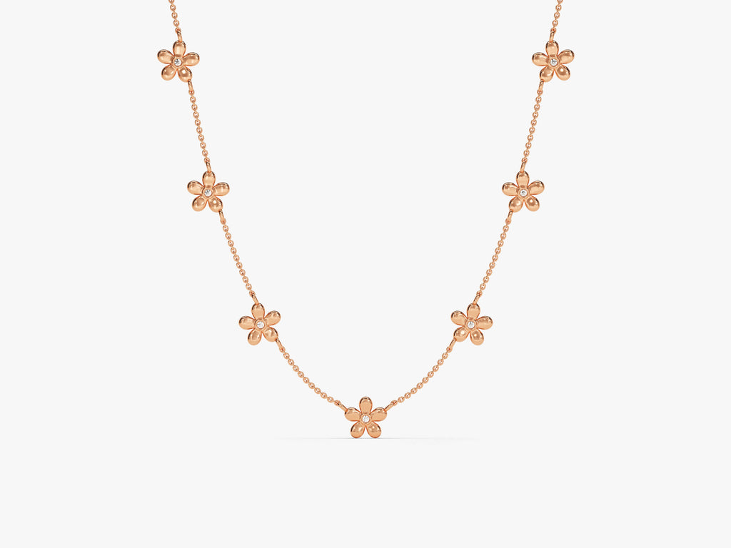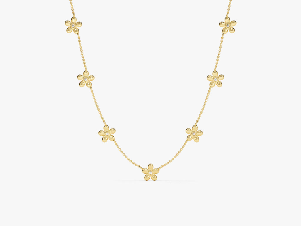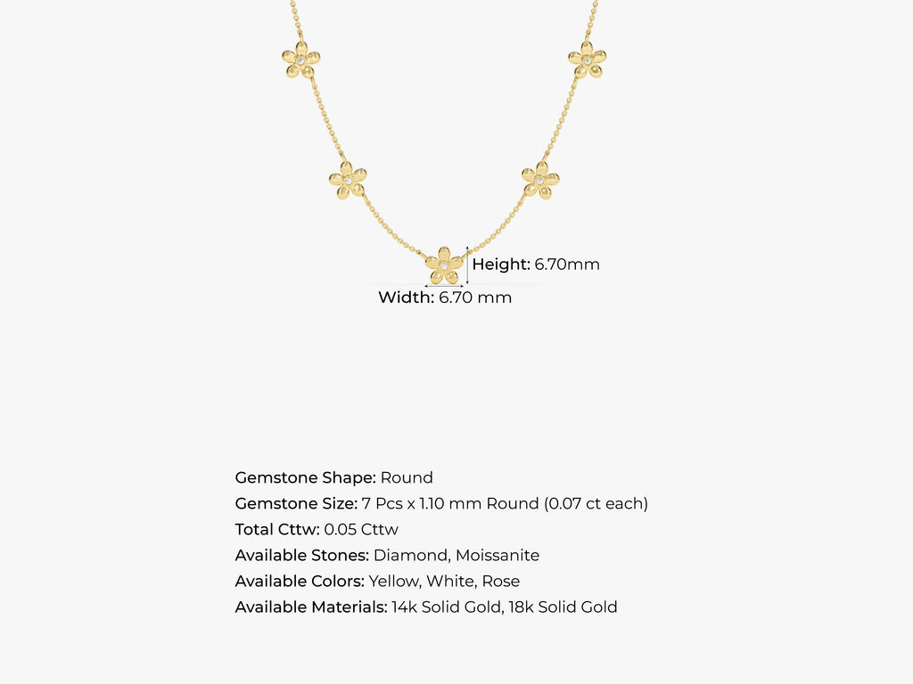 Crafted from solid gold, gold vermeil or sterling silver. Flower Station Necklace features a delicate chain adorned with charming flower-shaped stations, each embellished with sparkling diamonds or moissanite. The floral design adds a touch of femininity and whimsy to the necklace, while the diamonds provide a dazzling brilliance.