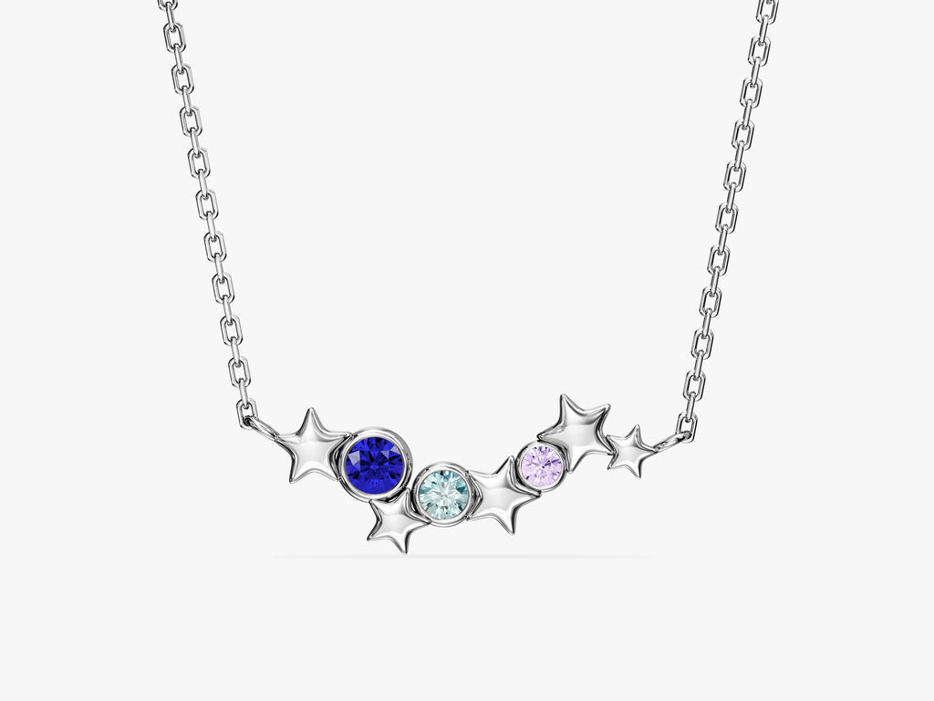 The Flowing Star Birthstone Necklace features a graceful, star-inspired design accented with up to 5 customizable birthstones. With its elegant flow and celestial charm, this necklace beautifully symbolizes the bond between loved ones, making it a perfect gift for any special occasion.