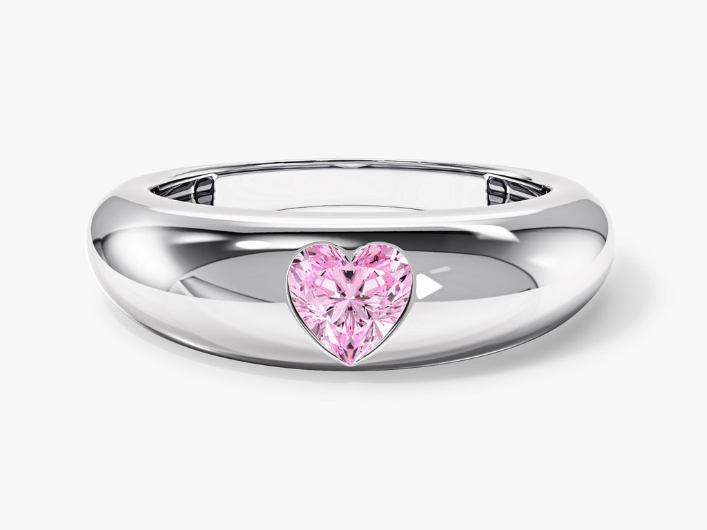 Featuring a romantic heart shaped gemstone encased in a smooth bezel setting, the design ensures both brilliance and durability. The thick band adds a contemporary edge, symbolizing strength and commitment, while offering a comfortable fit for everyday wear.