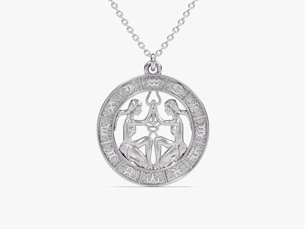 The focal point of this necklace is an intricately designed gemini charm, skillfully fashioned from brilliant solid gold, gold vermeil or sterling silver. The charm prominently features the symbol associated with gemini – the Twins. The design captures the dual nature of the sign, often depicting two figures or symbols representing the twins, showcasing the adaptability and versatility characteristic of Geminis.