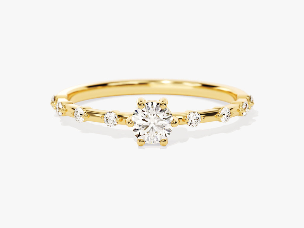 Experience the beauty of this Half Eternity Distance Ring. Crafted with gold vermeil, sterling silver or solid gold, this ring is adorned with round brilliant cut diamonds - moissanites that make for a stunning and sparkly display. The stones are set in a prong setting for maximum sparkle at every angle. A timeless piece that will never go out of style.