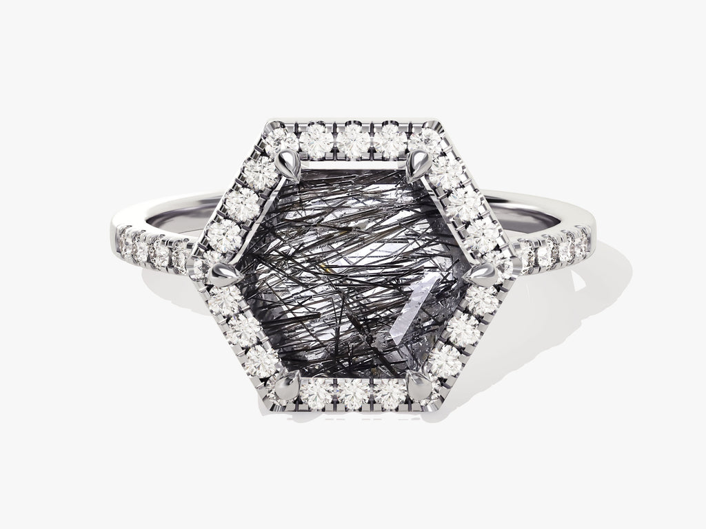 Halo Hexagon Black Rutilated Quartz Engagement Ring with Pave Set Moissanite Sidestones