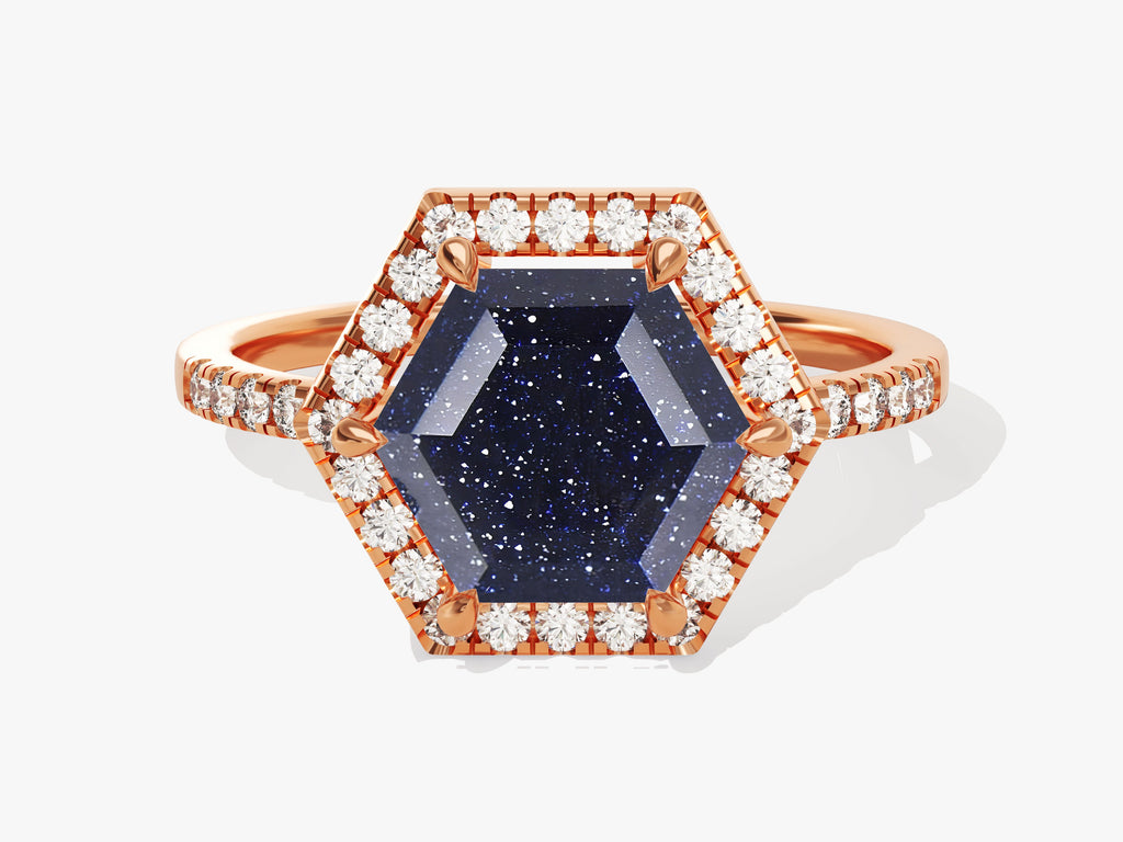 Immerse yourself in celestial charm with our Halo Hexagon Blue Sandstone Engagement Ring, showcasing a captivating hexagon-cut blue sandstone as its centerpiece. The shimmering particles within the blue sandstone evoke the enchanting beauty of a starlit night sky.