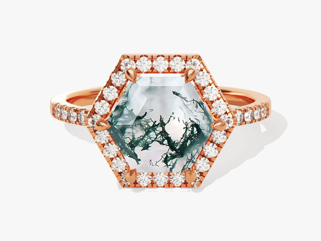 Celebrate the beauty of nature with our Halo Hexagon Moss Agate Engagement Ring, featuring a captivating hexagon-cut moss agate at its heart. The intricate patterns within the moss agate evoke the organic charm found in the natural world. Surrounding this captivating gem is a delicate halo of pave set Moissanites, enhancing the overall brilliance of the ring.