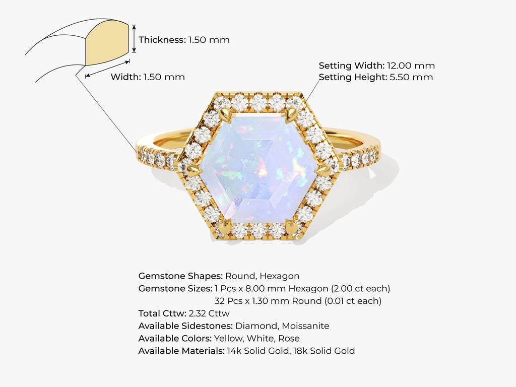 Step into a world of enchantment with our Halo Hexagon Opal Engagement Ring, featuring a captivating hexagon-cut opal as its centerpiece. The opulent play of iridescent hues within the opal captures the magical essence of ever-changing beauty.