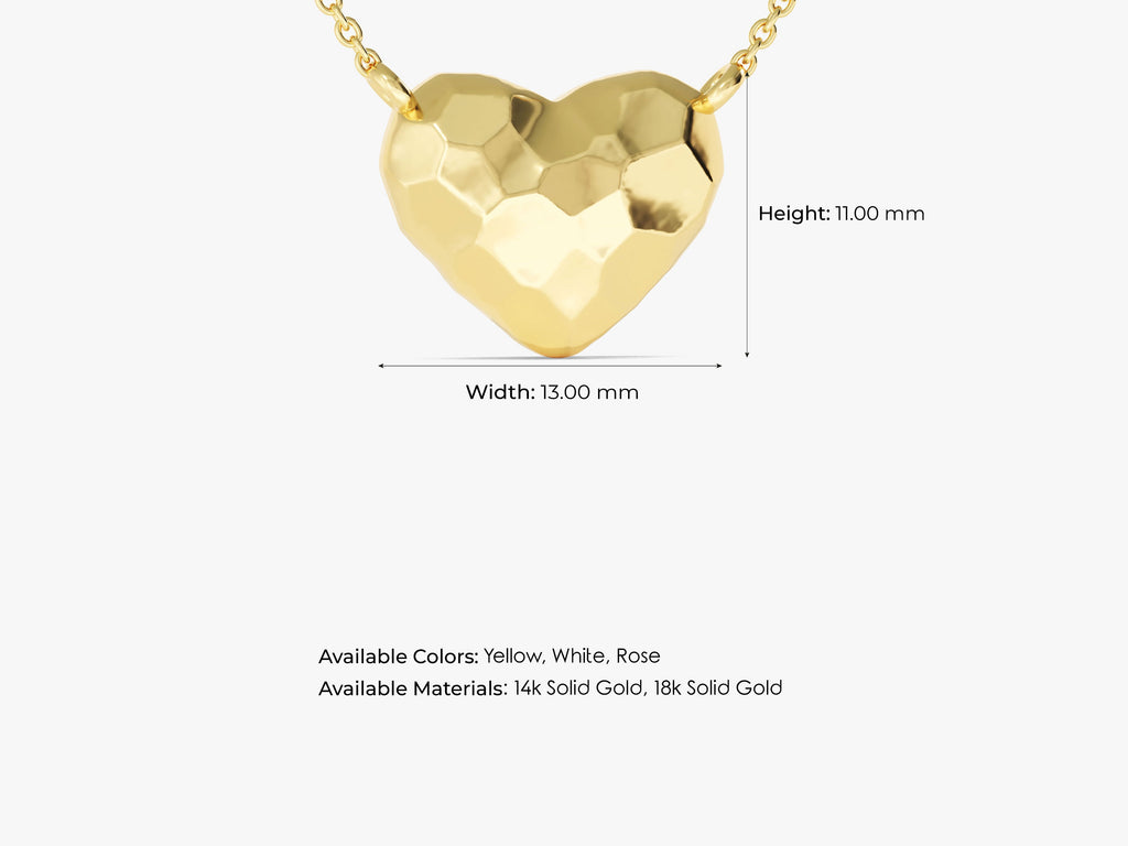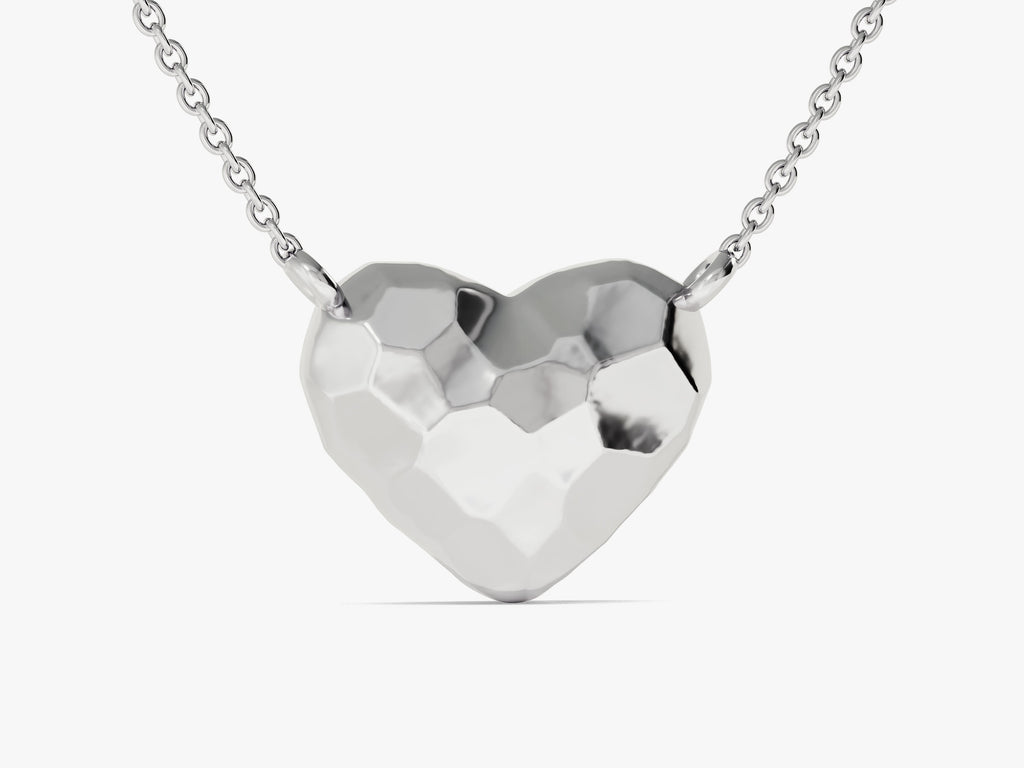 This charming piece combines a timeless symbol with a touch of modern texture. A delicate heart, crafted from solid gold, gold vermeil or sterling silver (available in classic yellow, white, or rose), features a beautiful hammered finish. This adds depth and dimension, catching the light and creating a captivating shimmer. The modern, textured finish adds a touch of personality without overwhelming the timeless design. This necklace transitions seamlessly from day to night, making it a versatile addition to your jewelry collection.