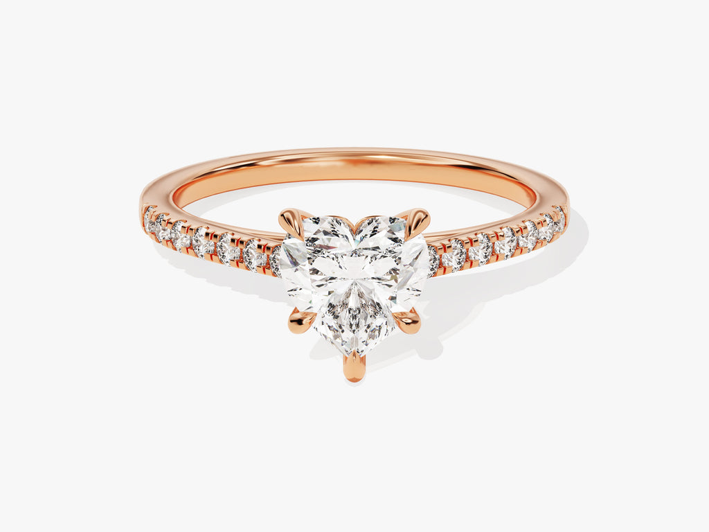 Capture timeless romance with our Heart Cut Moissanite Engagement Ring featuring Pave Set Side Stones. This enchanting ring showcases a breathtaking heart-cut moissanite center stone, celebrated for its unique charm and brilliant sparkle. The band is elegantly adorned with smaller moissanite stones meticulously set in a pave style.