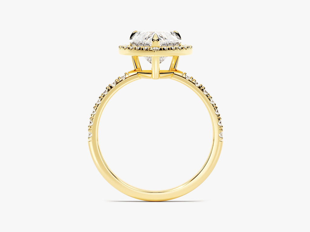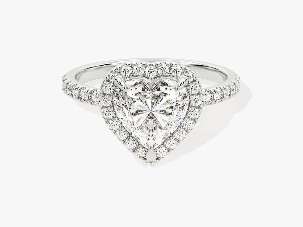 Capture hearts with our Heart Halo Lab Grown Diamond Engagement Ring with Pave Set Side Stones, a timeless and breathtaking expression of your affection. The centerpiece of this design is a stunning heart-cut lab-grown diamond, meticulously created to emphasize its remarkable clarity and captivating beauty. The intricate pave setting and halo design, featuring ethically sourced diamonds, creates an atmosphere of refinement and elegance.