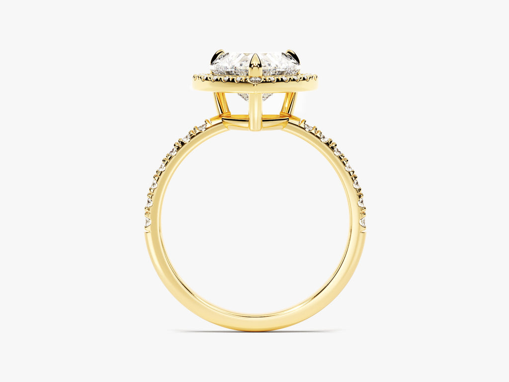 Celebrate your love with the Heart Halo Diamond Engagement Ring featuring Pave Set Side Stones, an embodiment of timeless allure and contemporary sophistication. At its core, a stunning heart-cut diamond takes center stage, designed to captivate with its unique allure. The band and the halo, adorned with meticulously set pave side stones, add an extra layer of shimmer and elegance to the ring.