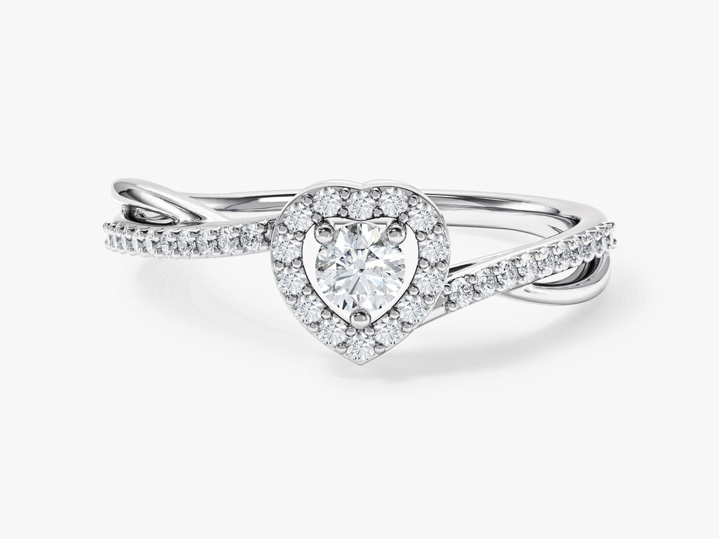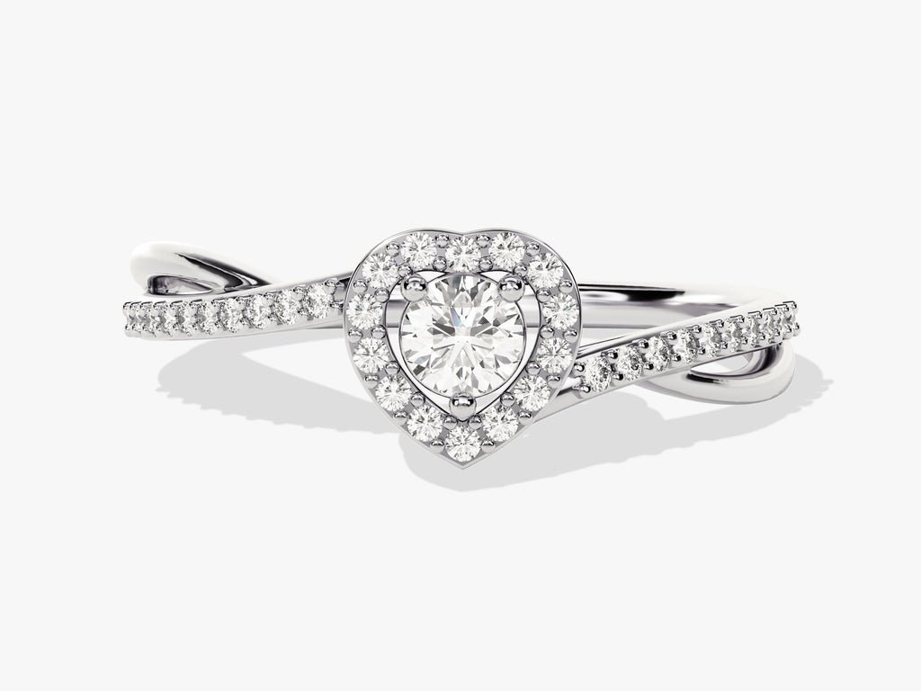 This engagement ring features a dazzling round moissanite surrounded by a heart-shaped halo of moissanites, with a twisted pave moissanite band adding extra sparkle. It is a perfect blend of romance and elegance.