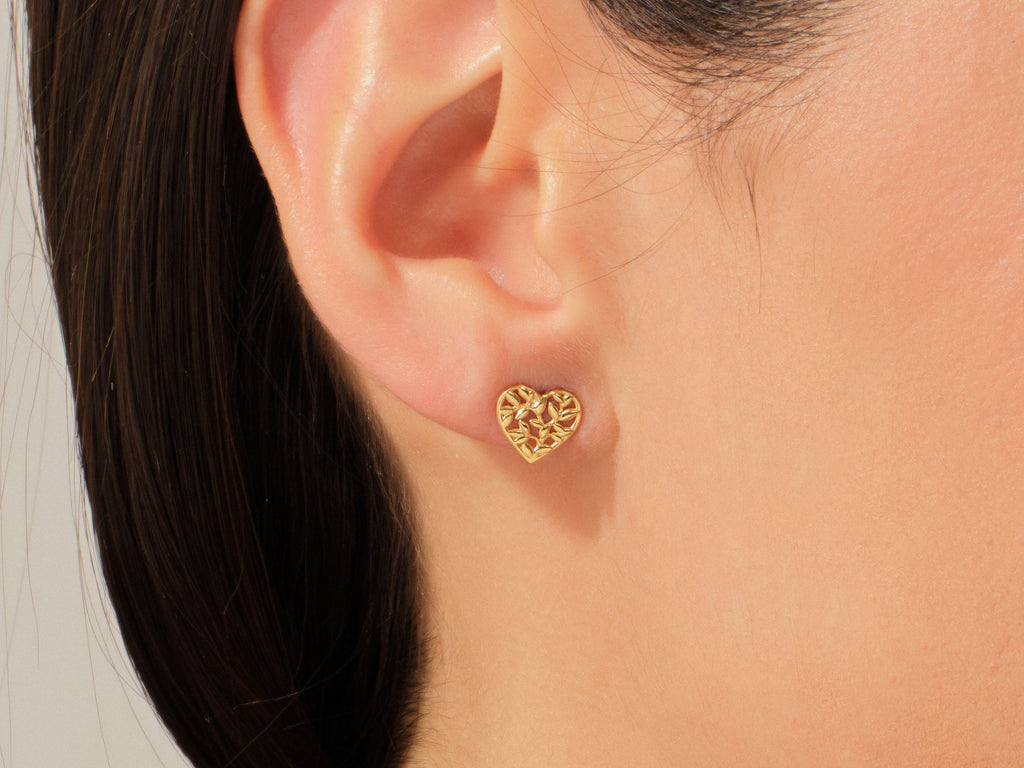 Each stud features a meticulously shaped heart with a graceful leaf design, creating a unique and enchanting aesthetic. The use of high-quality material adds a touch of luxury, radiating a warm and inviting glow that complements various styles and occasions.