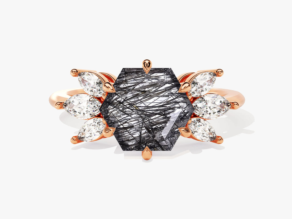 Hexagon Black Rutilated Quartz Engagement Ring with Moissanite Sidestones