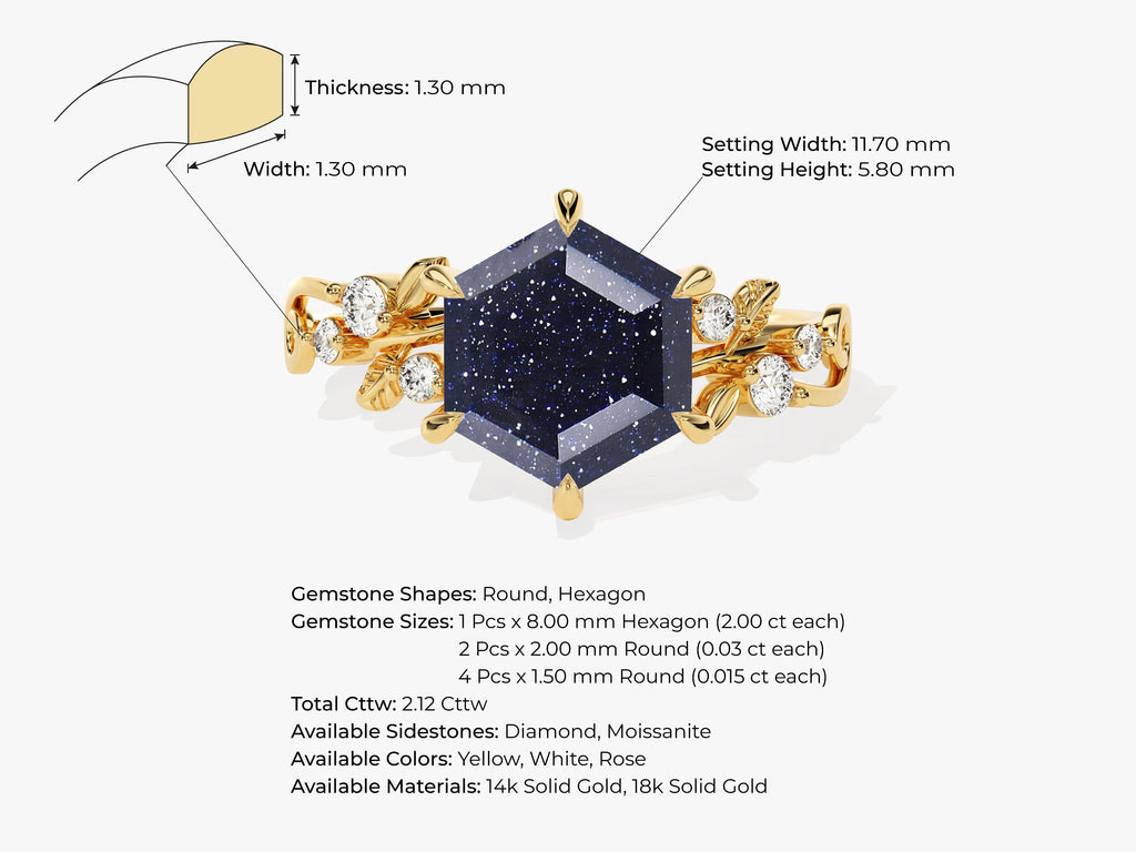 Experience the enchantment of nature with our Hexagon Blue Sandstone Nature-Inspired Engagement Ring, featuring a captivating hexagon-cut blue sandstone at its heart. The shimmering particles within the blue sandstone evoke the serene beauty of a starlit night sky, bringing the magic of the outdoors to your fingertips.