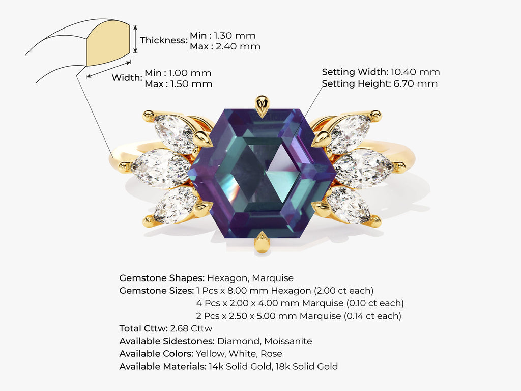 Our Hexagon Alexandrite Engagement Ring with Moissanite Sidestones is a symbol of a love that is as dynamic and extraordinary as the gem it showcases.The hexagon-cut alexandrite at the heart of this ring is a mesmerizing display of color-changing beauty, shifting from lush greens to deep purples, creating an ever-evolving visual masterpiece. Flanking the alexandrite are carefully placed marquise moissanite sidestones.