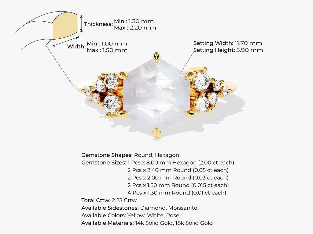 Immerse yourself in the enchanting allure of our Hexagon Moonstone Engagement Ring, adorned with a brilliant Moissanite Cluster. The focal point of this captivating ring is a hexagon-cut moonstone, radiating an ethereal glow reminiscent of moonlit nights.