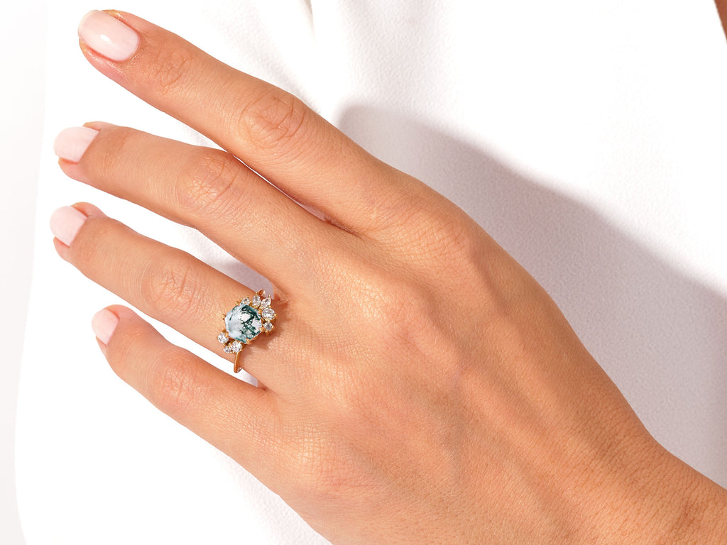 Embark on a journey through time with our Hexagon Moss Agate Vintage Engagement Ring, featuring a captivating hexagon-cut moss agate at its heart. The intricate patterns within the moss agate evoke the charm of a bygone era, creating a ring that is both timeless and unique.