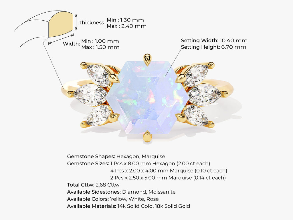 Embrace the magic of your commitment with a ring that captures the enchanting allure of opalescence.At its core, a mesmerizing hexagon-cut opal steals the spotlight, displaying a kaleidoscope of iridescent hues that dance and shimmer with every movement. The opal's play of color creates an enchanting and ever-changing visual symphony.