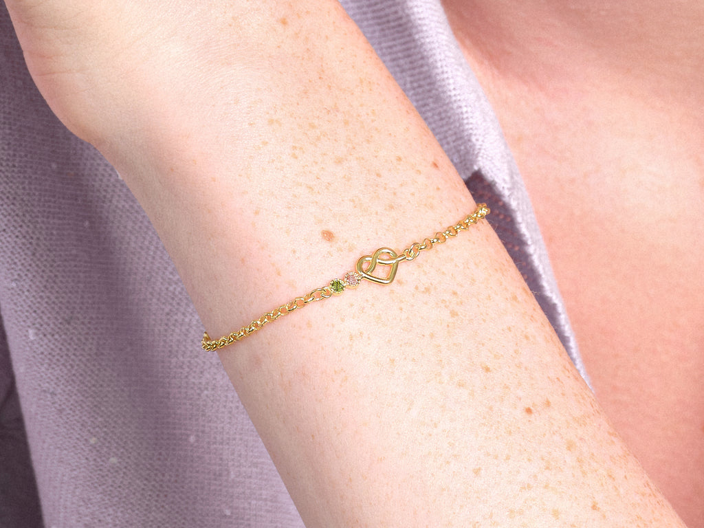 Our birthstone rolo chain bracelet features a unique knotted heart symbol and tiny birthstones on one side. Just choose the birthstones that hold special meaning to you or a loved one, and we’ll create a personalized piece that you’ll cherish for a lifetime. With its elegant design and thoughtful details, this bracelet is a beautiful way to celebrate birthdays, anniversaries or any occasion that’s special to you.
